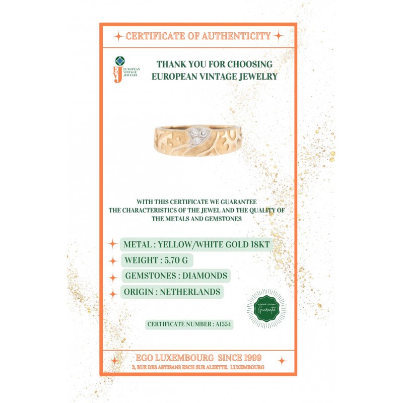 Pretty yellow gold ring carefully elaborated thanks to the finishing details on the upper part of the ring body. Diamonds complete this ring. Available in one size.